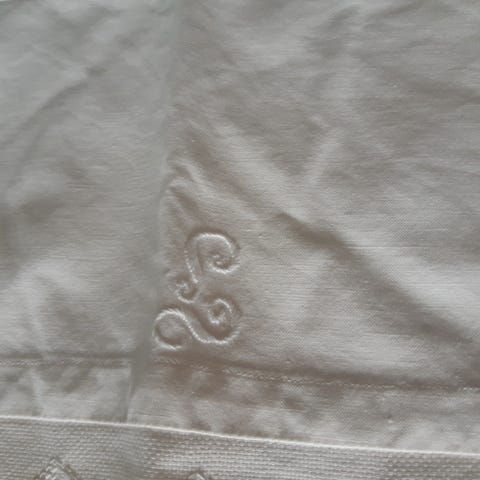 Putevar fra oldemors tid. 57x52 cm. Delvis slitt heklet mellomverk. Litt rep. på hekling må til. Pent og helt hvitt stoff.