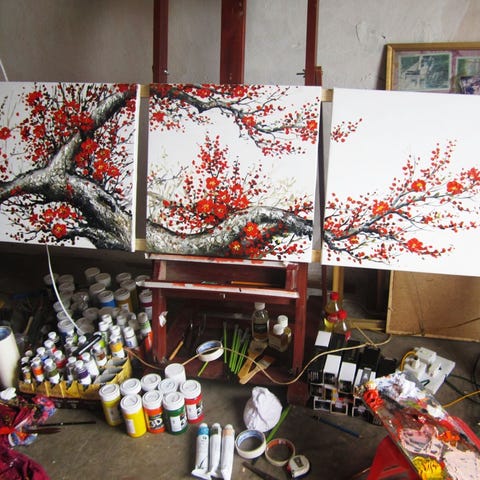 Maleriene er montert på sterk blindramme 3,5 cm tykk.