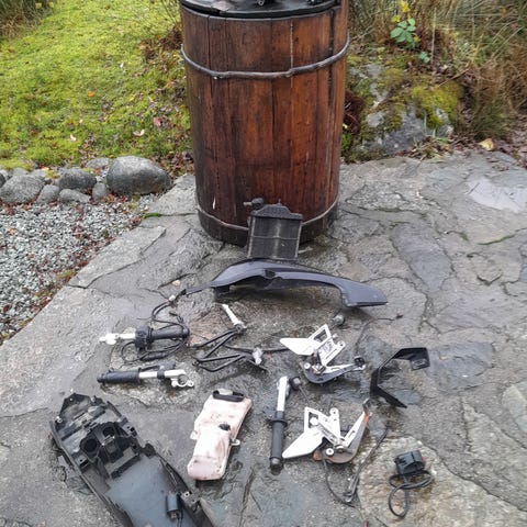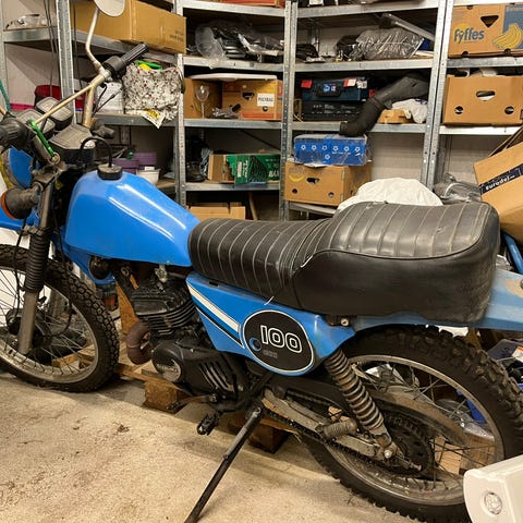 Nye dekk, slanger, felgband, bremseband, wirer, speil, eksos-potte, baklys, forgasser, blinklys-glass, diverse rep-sett, sete-trekk, nøkkel-emner for sliping av nøkkel, service manual og brosjyrer, power-filter, trimforgasser, styre, deksler