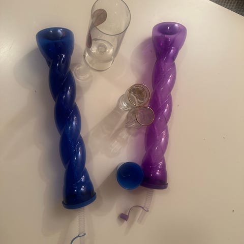 Gis bortLöwenbräu Export Hell glass og dekorative glassrør i blå og lillaArendalLegg til som favoritt.