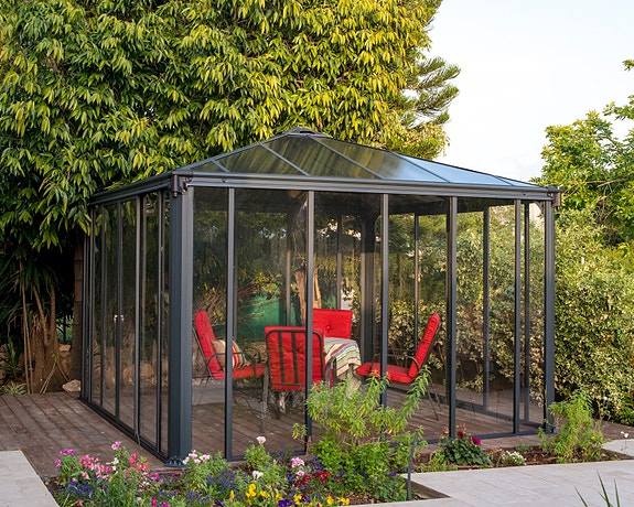 - Hagestuer, terrassetak, paviljonger og drivhus fra CANOPIA-sortimentet til PALRAM
