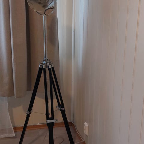 2 stk orginale engelske teaterlamper på høy fot. På begge kan beina justeres fra ca 70 cm til ca 150 cm. I tillegg kommer selve lampa på toppen... så de kan bli ganske høye. Alt av ledninger er byttet ut - så de funker. Dog er det engelsek kontakt på dem, så enten ett adapter, eller en norsk stikk og bytte enden. En fantastisk rustikk look på begge 2. Kr 4500 pr stk. Importerer du dem fra England er det ca 5000 kr pr stk + porto. En replika lampe koster ca 5000, disse er ekte og brukt i teateret.