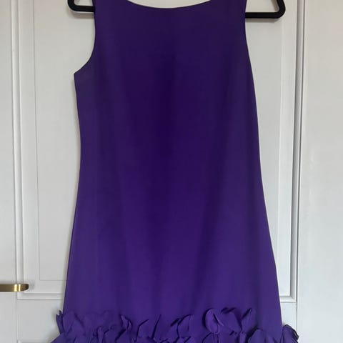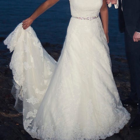 Kjolen er vakker med nydelige broderte detaljer og slep som kan henges opp med knapper bak. Den er i str 36/38 og er lagt opp 160 cm høyde med 5 cm hæl, men kan syes både ut og inn i livet og legges litt opp og ned på lengden.