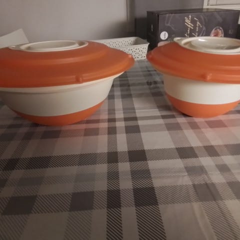Sett i grønt gult og orange, til 600 kr, den største er 4,5 liter