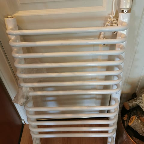 Håndkletørkeren kan plasseres stående på gulvet eller festes til veggen ( braketter, plugger og skruer følger med for begge alternativene ).