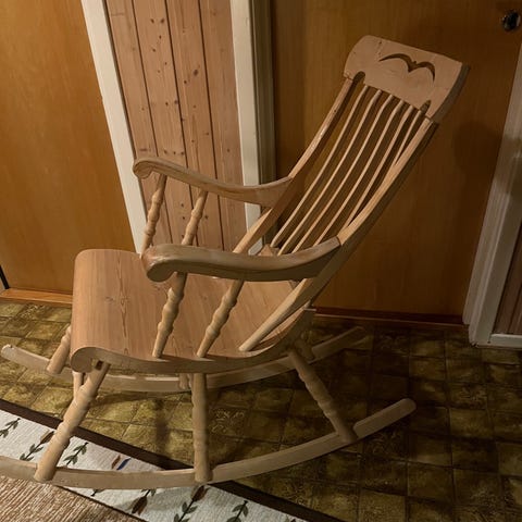 Gyngestol i bøk/ask? Trenagler. Sittehøyde 46 kr. 800
