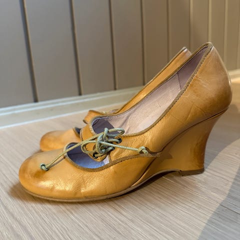 2. DIANE von FURSTENBERG cow hide animal ballerina sko. Mørk sjokoladebrun ku skinn. For og innersåle i gullfarget skinn.Hel ca 1.2 cm. Cushion innlegg i front under. Str US 7M som tilsvarer norsk str 37.Brukt 2 ganger og fremstår som ny. Det er kun på undersålen man ser at de er brukt. Kommer med dustbag. Kr 1090.