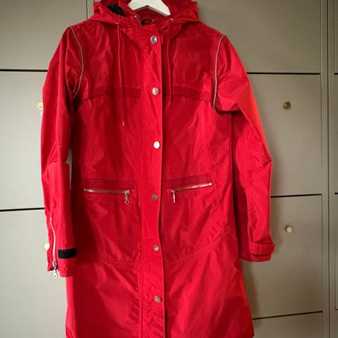 Ny regnkåpe, merke Jazz, str 40. Lett boblefor i hele kåpen, også i ermer. Vrangbord på ermer. Glidelås og trykk-knapper i front. Hette med snøring. Refleks i mønster og sømkant. Myk og lett kvalitet.