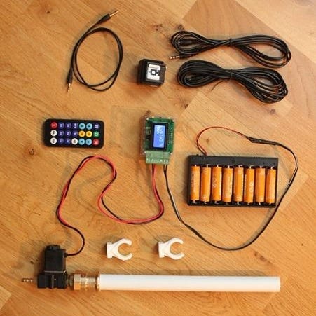 Dette er en liten rigg for dråpefoto. Pakken inneholder en hi-speed timer som styrer en magnetventil, kamera og blits. Slik kan du slippe dråper på en kontrollert måte og ta fantastiske makrobilder av dråper som kolliderer i lufta.