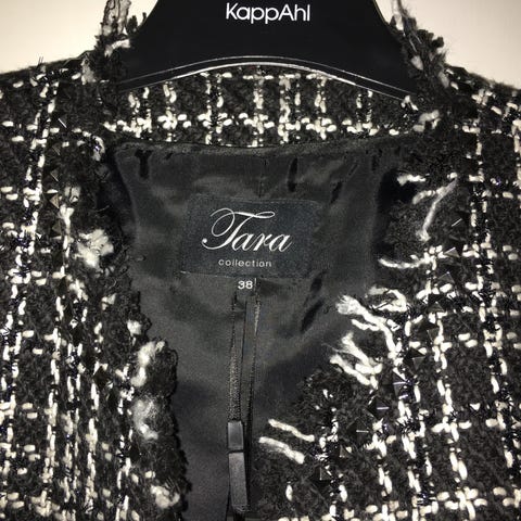 Ubrukt kvalitetsjakke fra TARA collection i str. L. 50% viscose, 45% polyester, 5% elastan og foret er i 100% polyester. Jakken er i et tungt materiale og faller fint. Kr. 200,-.