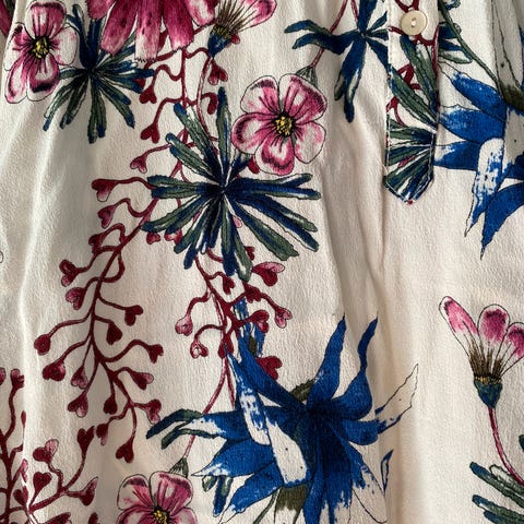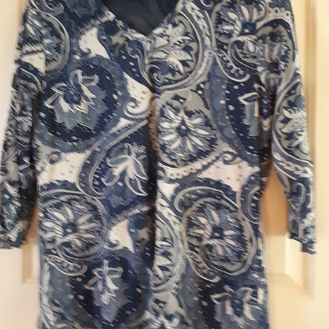 Jeg ønsker å selge en pen hvit ubrukt tunika med knytting, merket Zavanna, st. 40. Pent mønster ved halsringingen. Pris: kr. 150,-.