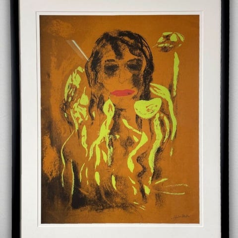 Maleri med treramme, passepartout og glassfront. Motivet har uante assosiasjoner. Vannmaling.
