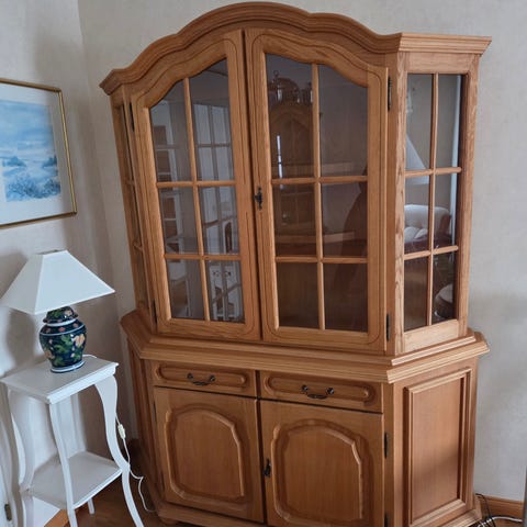 Et nydelig eikeskap til salgs. Det er et framskap med glass i dørene på øverste del og tette dører på nederste del. (Nypris ca 12.000,-) Skapet er fint og selges pga flytting. Passer nesten alle bomiljø.