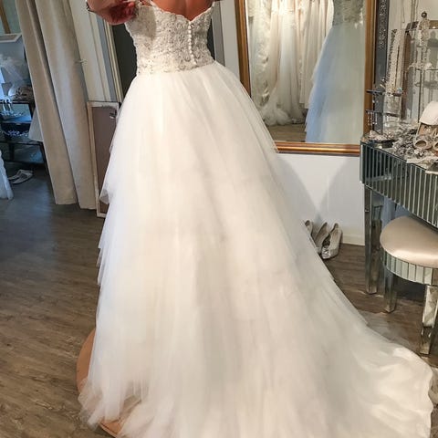 Kjolen er kjøpt på brudesalong i Nice og er brukt en gang.