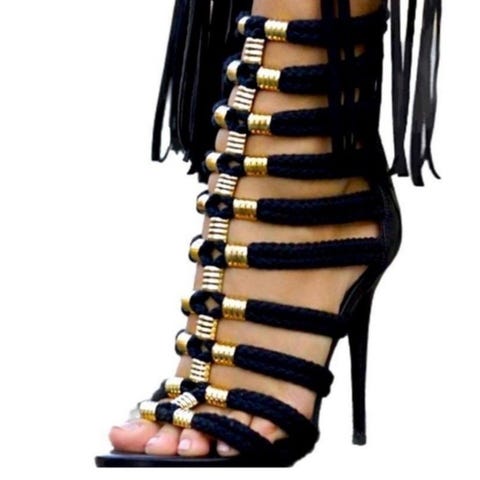 BALMAIN x H&M/PREMIUM QUALITY. Et par sandaletter i semsket skinn brodert med perler, bånd og strass-slipte stener. Sandalettene har glidelås ved hælen og åpen tå. Fôr og innersåler i skinn. Hæler 11 cm. Skinnsåler.