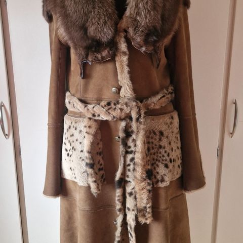 Prisantydning er 7.900 kr. Kan pruttes! Kåpen har som ny kostet ca 25.000. Kåpen har et elegant snitt, pene, myke skinn og pene skjæringer. Den er veldig pent brukt! Den har en stor og myk krave. Kåpen er veldig god og varm! NB! Gamle skinn - gjenbruk!