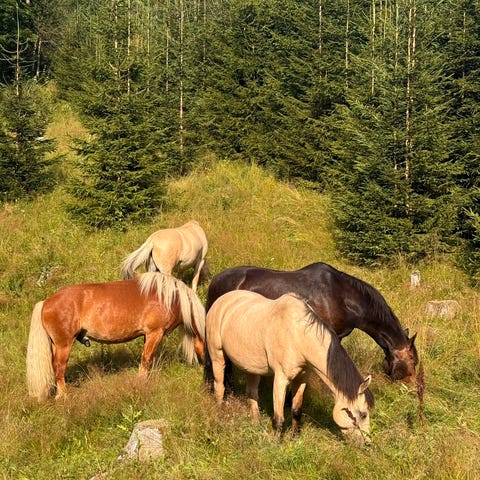 Hestene kommer ut ca 6.30 i hverdagene og ca 8 i helgene, di kommer inn rundt 22-23 hvis det ikke er dårlig vær.
