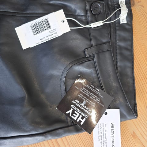 Sorte Needle/Pleather bukser høyt liv og skinny leg. Størrelse 26/32 ( liten i størrelsen, mulig 25/32). Pris 400,-