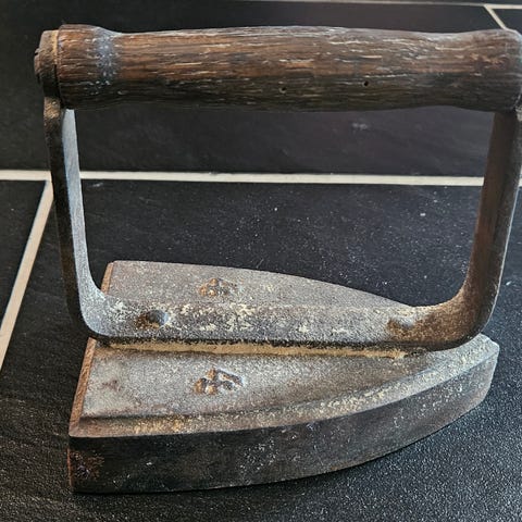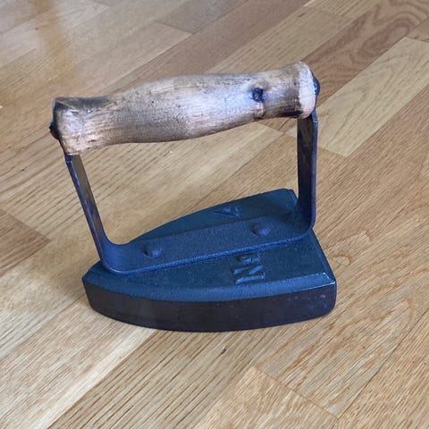 Gammelt strykejern i jern. Håndtaket er litt løst.