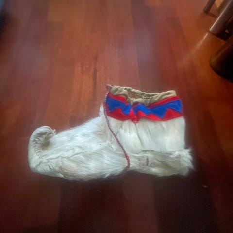 Kona vil selge den fine og dyre støvler/skoen sin. Den er ekte kinn. Laget av reinsdyr tror ligner på det.
