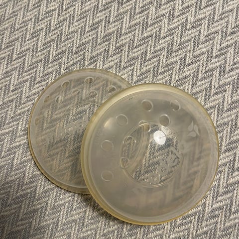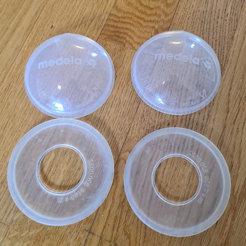 Medela brystskjold. Beskytter såre eller sprukne brystvorter mot friktion før og etter amming. 100,-