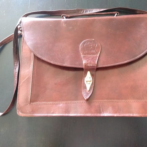 Lite og pent brukt, brun skinn veske for han eller henne til salgs. Passer til dokumenter, Pc 13 tommer, skolesaker eller det du vil bruke den til.