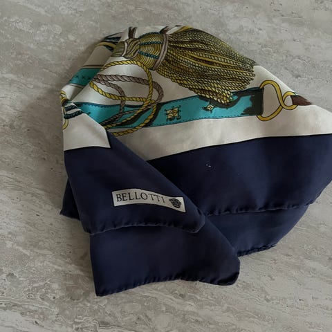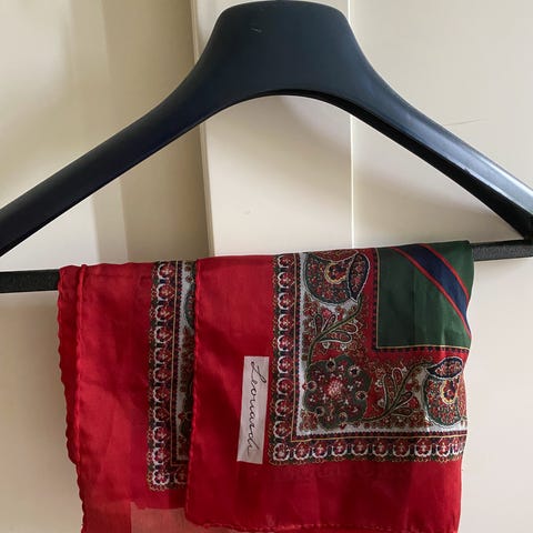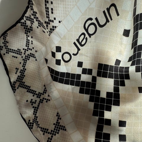 Jeg kjøpte dette Ungaro-skjerfet via Ebay eller Etsy for rundt 15 år siden. Det ser ut som det kan være fra 70-tallet, ganske sikkert vintage, men jeg vet ikke nøyaktig hvor gammelt det er. Kult er det uansett. Ikke så stort, men rektangulært og greit å knytte rundt halsen.