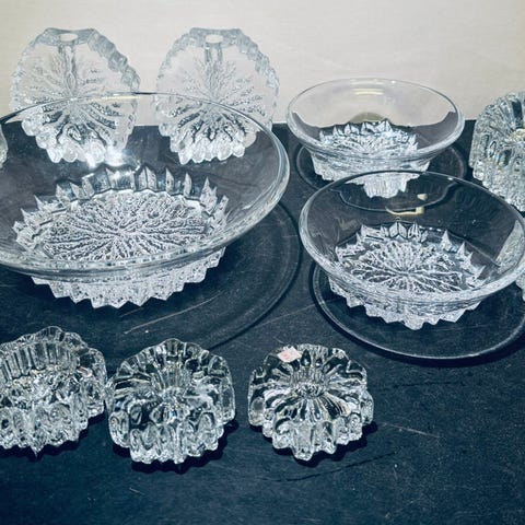 Nautilus vase, lysestake og konfektskål i krystall fra Hadeland glassverk. Design Willy Johansson, ca 1979