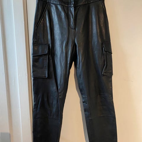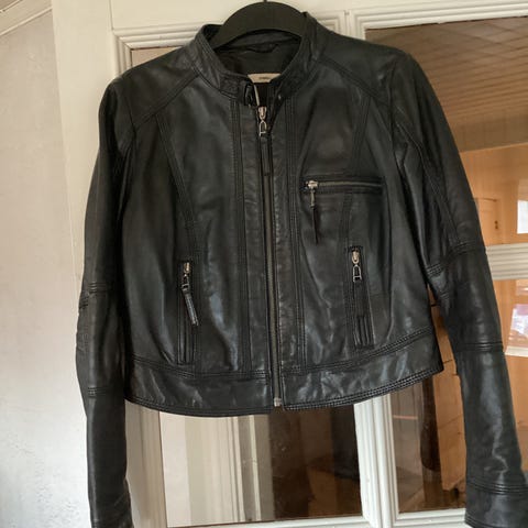 Nydelig Dranella gråblå kort kortermet jakke i ekte skinn med skinntrukne knapper selges på grunn av at jeg har for mange klær. Den er aldri brukt og er som ny, helt uten flekker eller skader.