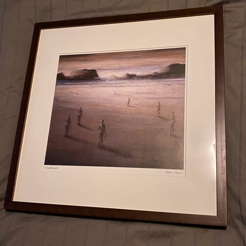Maleri av Fulvio Pentassuglia selges for 1200 kr. Bilde er kjøpt i 1979 og heter fjord. Bilde er 87cm+76cm