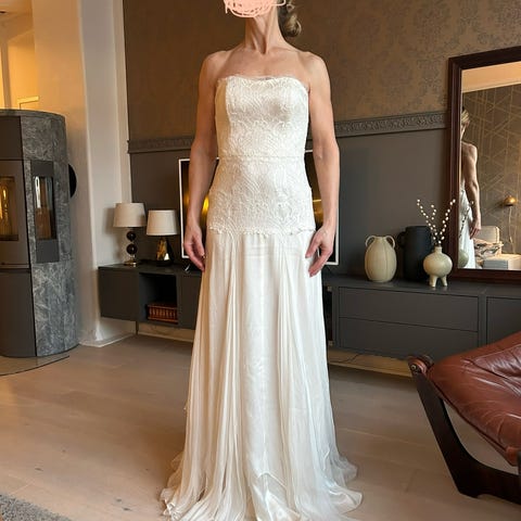 Pent brukt Sadoni brudekjole, ferdig renset. Kjolen er størrelse 36, men kan lett tas både inn og ut. Den er tilpasset av sydame.