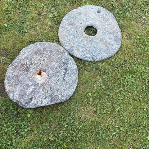 Jeg har solgt hytta mi og tømmer den nå for innbo. Nå har jeg igjen smørstampen du ser rett ved peisen. Ukjent alder. Flettede vidjer rundt stampen.