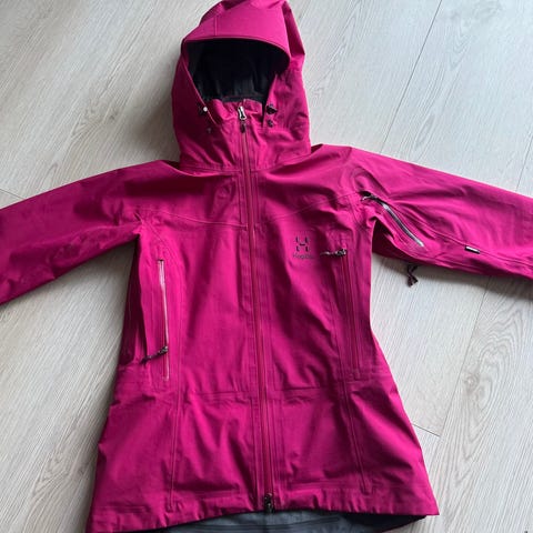 Brukt Haglöfs Goretex jakke str M til dame. To lommer med glidelås i front. Hette med snøring. Kan trenge ny impregnering