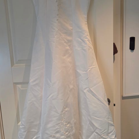 Selger to nydelige brudepikekjoler i str 10 og 12 år, brukt én gang. Like pene. Kremhvit farge. Tilhørende sko, str 35 og 36. Noe merker. De i str 35 på bildet. Passende bolero-jakker kan også selges. 500 kr pr kjole.