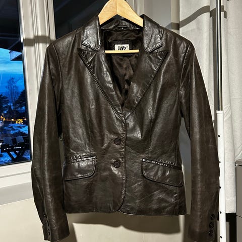 Skinnjakke made in Italy laget ev ekteskinn mørke brun farge, stilig, str 36-38, har vært i bruk 4-5 gng. Ny pris er 3500 .