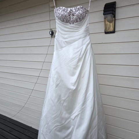 Kjolen er fargen Ivory med broderi på overdelen som fortsetter diskret nedover skjørtet. Hjerteformet topp med innebygd korsett. Kjolen har glidelås i ryggen. Det er også mulig å sy inn en BH dersom ønskelig.