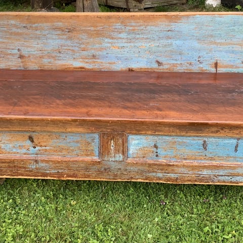 Benken kan omgjøres til seng ved å trekke ut skuffen og legge i madrass. Rommet kan ellers brukes til oppbevaring. Benken er i god stand.