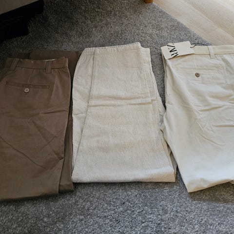 Selger flere dressbukser / penbukser / bukser. De er lite brukt. Har bukser i fargene sort, lys grå, grå og blå. Alle har rette ben og normal passform. Måler gjerne nøyere om det trengs. Har ca 6 bukser igjen i ulike farger og str. Selges for kun kr 99,- pr bukse. Se tekst under hvert bilde for nærmere detaljer og beskrivelse.