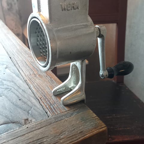 Gammelt kjøkkenredskap selges. Har mandelkvern igjen, 1 øse er solgt. Mandelkvern selges for 250 , Øsen for 150. .