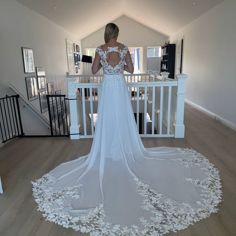 Lot's of ruffles in the back with a long train. Can pin up shorter after the ceremoni. Big Silk bow in the back. Lot's of sequence and "pearls" in the front breast area. Short ruffled arms. Open neck. Size S 34/36.