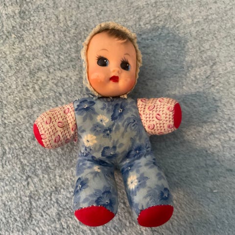 Selger tøydukker fra da jeg var liten. Den største er solgt. Dukka er ca. 32 cm lang. Den har en rød kjole som ikke er på bildet. Kan lage egen avtale med kjøper. Sender.