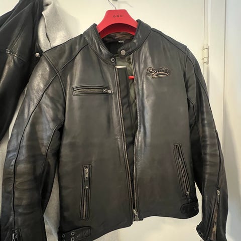 Motorsykkeldress (tykk), i skinn, lite brukt, str 48