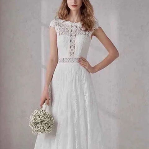 Nydelig brudekjole med mye perledetaljer fra pronovias modell Albeniz. Kan også enkelt brukes uten tøy over skulder ved å brette det innenfor kjolen. Slik brukte jeg den. Ny pris 17000kr.