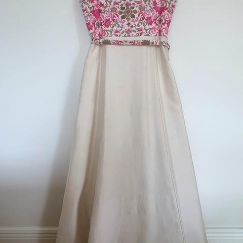 Lekker håndsydd råsilkekjole hos tidligere Gribenille på Brygga i Tønsberg. 4 deler. Sydd av kunsthandverker. Topp med stropper, skjørt helforet, midjevidde 70 cm, jakke og belte med borrelås, lengde 75 cm, og hekter. Lite brukt. I god stand og uten flekker. Ny pris kr. 2.200