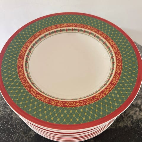 Ønsker å kjøpe deler til Villeroy & Bochs juleservice "Holly", deriblant 2 forretts-/frokosttallerkener, 4 mindre (dessert)skåler og 2 kaffekopper med fat.