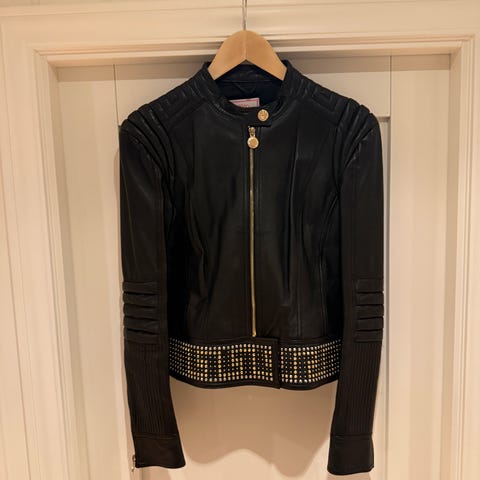 Lekker skinnjakke fra Versace HM. Italiensk størrelse, så noe mindre enn europeisk str. 40. Mykt lammeskinn. Følger med klespose og henger.