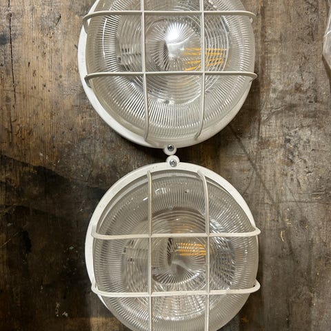 Nye utelamper til montering over eks.dør,trapper eller lignende.lengden er 26cm,bredden er 10,5cm,og utstikk fra vegg14cm. 250.pr.stk.+ frakt norgespakke 170kr.