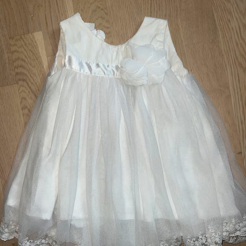 Hvit blomstret kjole. Fine detaljer. Tilsvarer str. 92/98. Hentes i Moss eller sendes mot porto.
