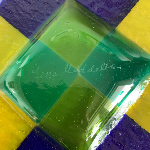 Fint lite glassfat laget av Lene Middelthon. Fatet er 14x14 cm.