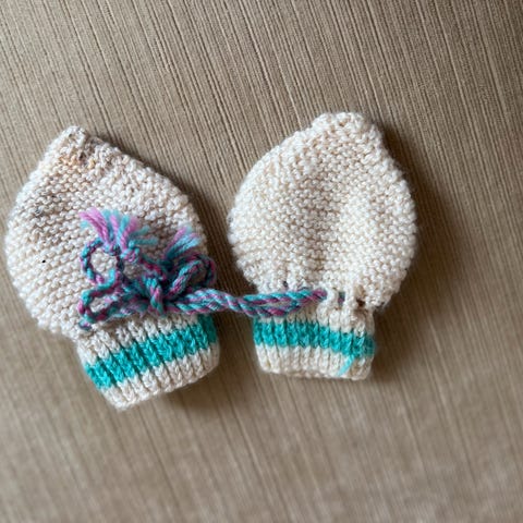 Håndstrikkede varme og gode sokketøfler til baby. Foten er ca 8 cm lang.